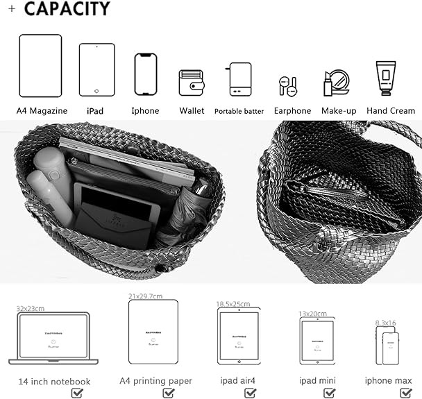 The handbag is made of soft high-quality vegan leather (slight leather smell is normal and harmless to human body, please let it dry for a few days, if you mind, take it carefully), very soft to touch and easy to wipe clean. No animals are harmed and it is good for the environment. Delicate woven detailing runs throughout the frame; inside is the same woven bag.