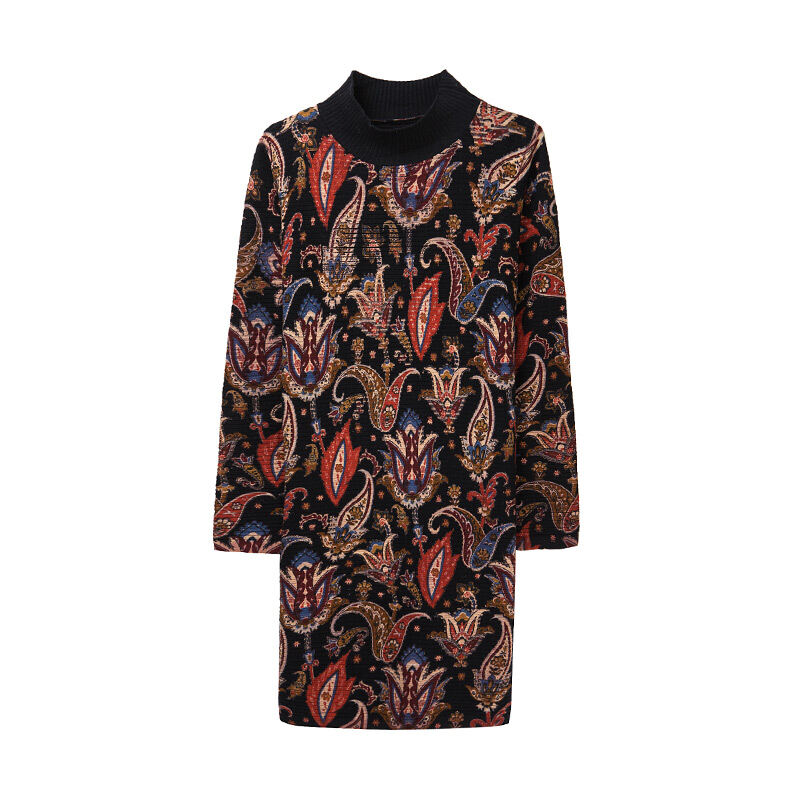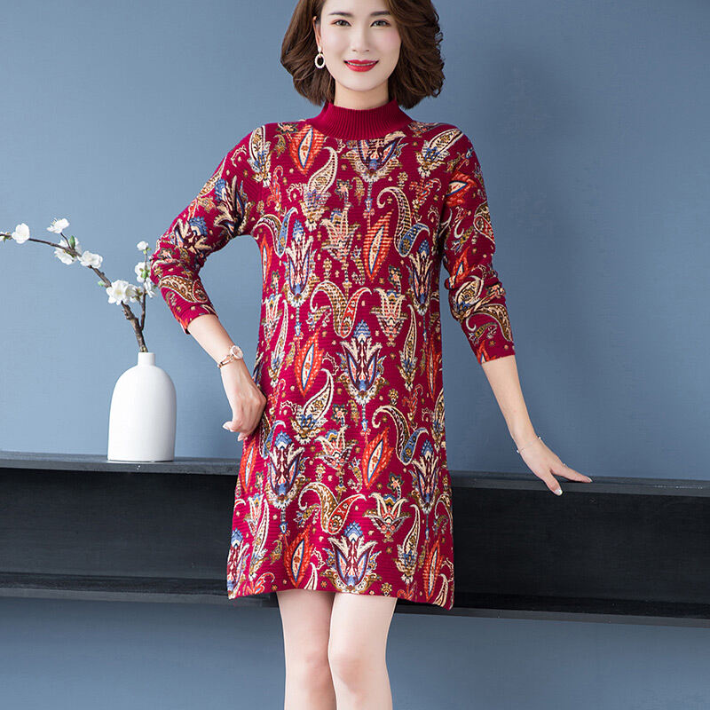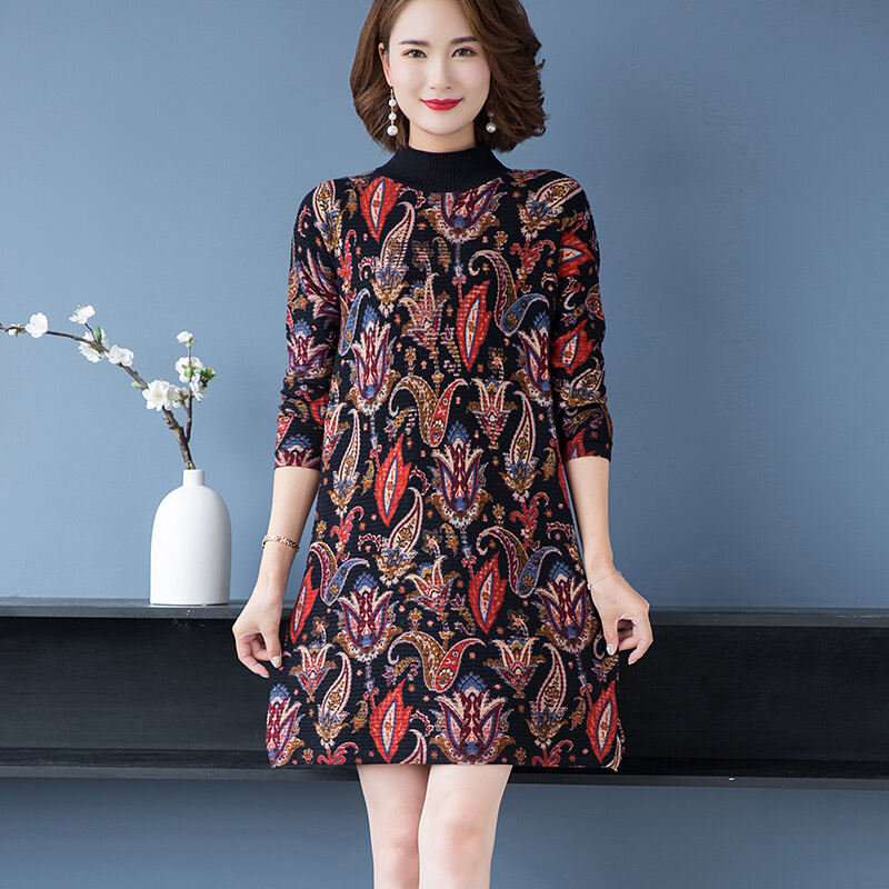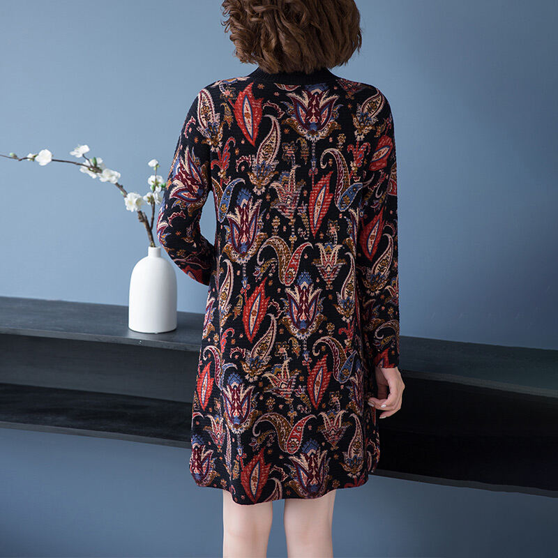 Ordos Pure Cashmere Female Western Style Printed Dress Sweater Mid-Length Autumn and Winter Mother Loose Cardigan