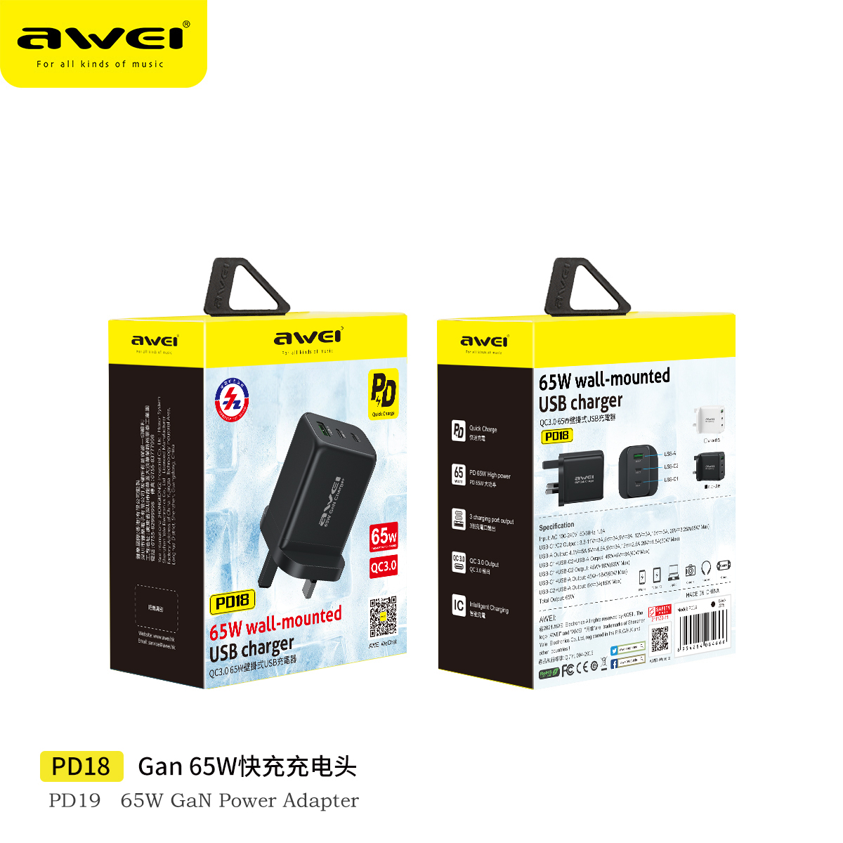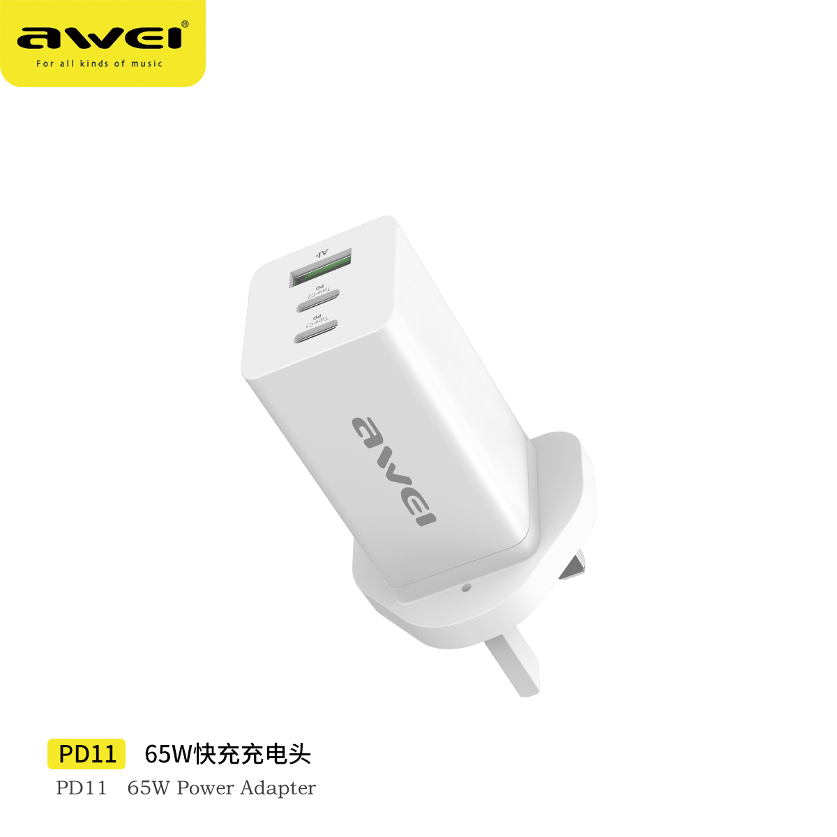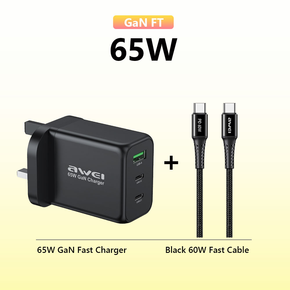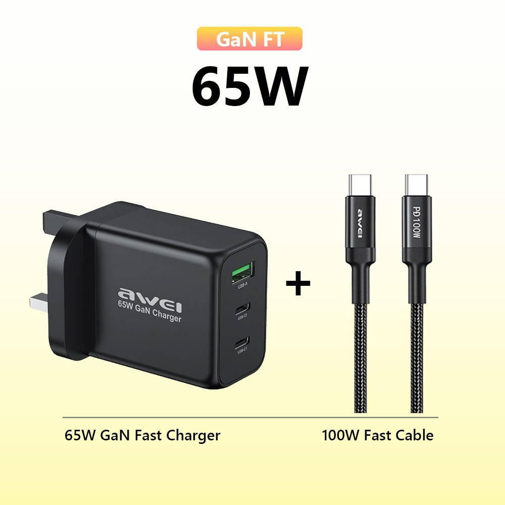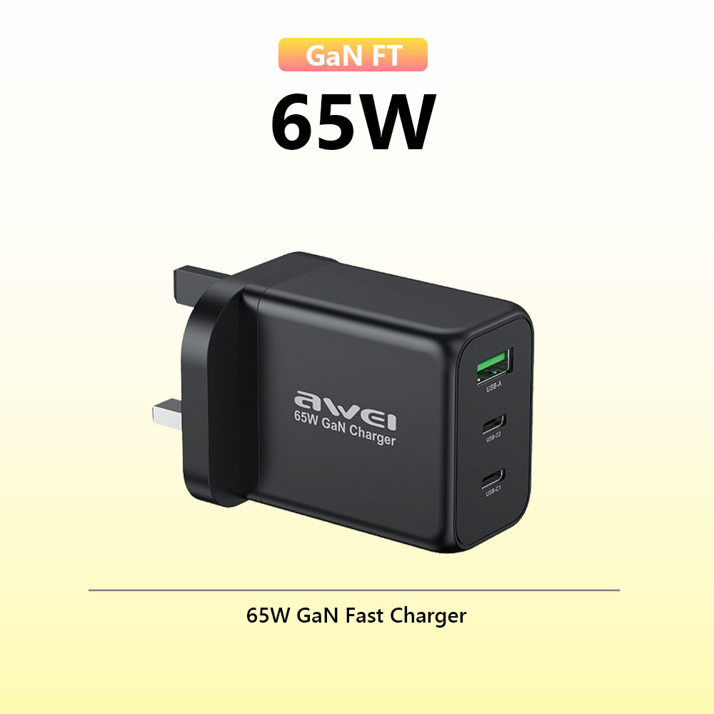Awei PD18 PD 65W GaN Fast Charger Quick Charge 2 Type C 65W 1 USB A 30W with QC 4.0 3.0 Portable UK Plug for airpods pro iPhone 13 12 XR Xiaomi Macbook M1 pro Laptop iPad Pro Huawei P20 P30 P40 sony w
