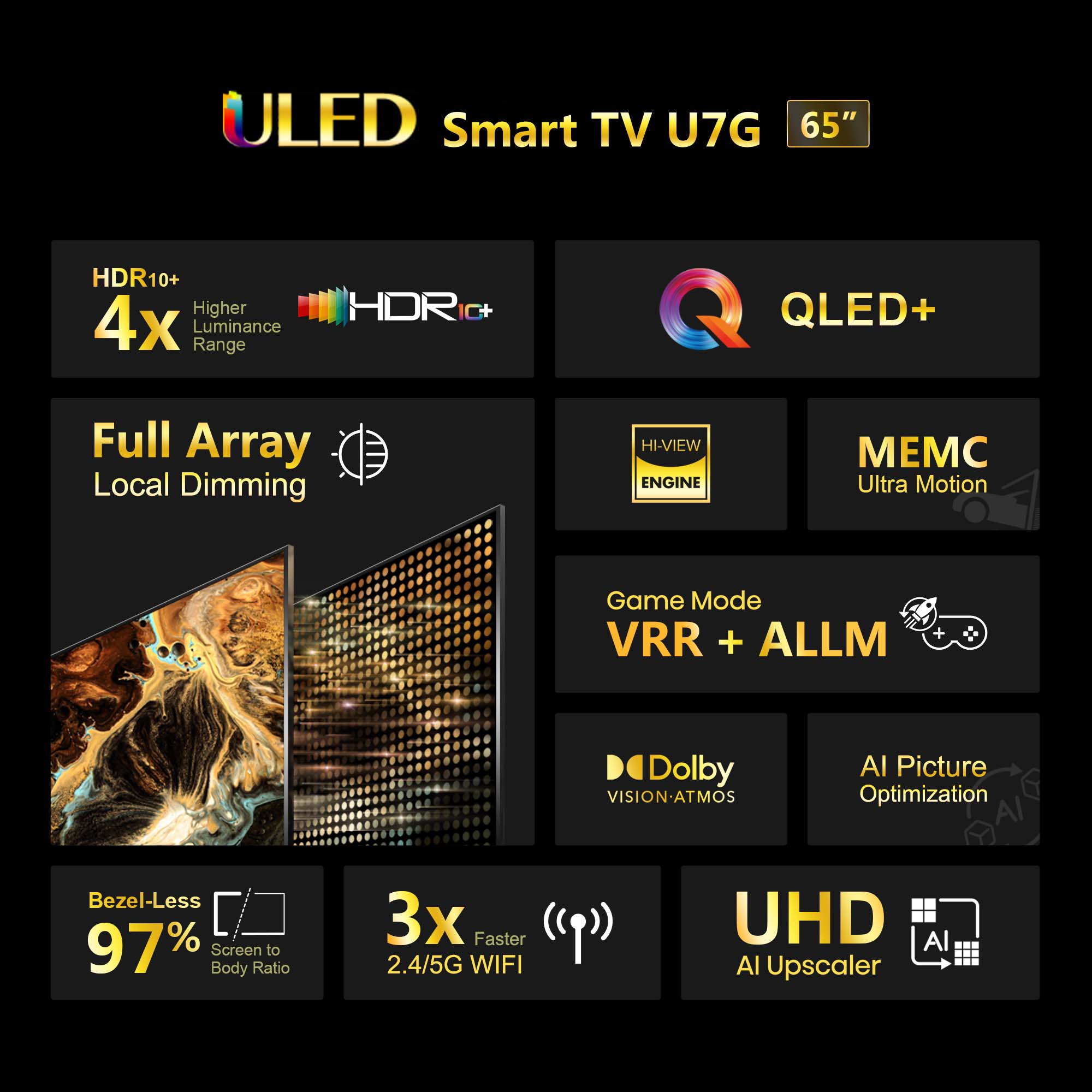 ?【Full Array Local Dimming】Ultra contrast for the most enhanced viewing experience ?【Dolby Vision & Atmos】Experience the most realistic holographic "surround" impact ?【HDR 10+】Highest brightness level of High Dynamic Range possible ?【4K Upscaling】4K resolution powered by AI chips ?【Hi-View Image Engine】 64bit Quad Core ARM Cortex-A72 up to 1.7GHz ?【MEMC】 Fast motion smoothing refresh rates ?【Game Mode】Low Latency VRR+ALLM, experience no lag in FPS games ?【Low Blue Light】Low Blue Light to protect your eyes anytime (TÜV certificate) ?【Smart TV】Pre-Programmed with Youtube, Netflix, Disney+, CNA and other popular smart TV apps ?【Anyview Cast】Cast your phone or other smart devices' screen to TV ?【Voice command】Voice control your TV and smart home devices, a hands-free experience ?【Bluetooth remote】Longer distance 360° control compare to a traditional infrared controller ?【Wireless】Supports 2.4G and 5G dual wifi and Bluetooth 5.0 ?【Built-in ports】4 x HDMI (1 eARC), 1 x USB3.0, 1 x USB2.0, Ethernet (Lan)