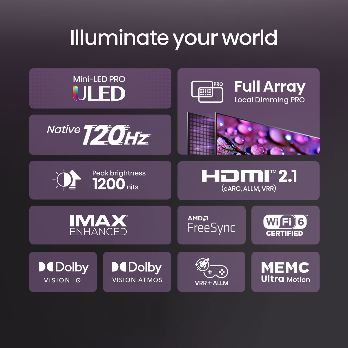 ?【Mini-LED】Smaller mini LED delivers deeper black, brighter highlights and even more precision. ?【Native 120Hz】Support a smooth and real-time response ?【Full Array Local Dimming Pro】Ultra contrast for the most enhanced viewing experience ?【Dolby Vision IQ & Atmos】Experience the most realistic holographic "surround" impact ?【WIFI 6】802.11ax - Faster WiFi speed ensures no buffering when watching high resolution movies ?【IMAX Enhanced】Deliver IMAX signature pictures to your home. Bring Cinema Home. ?【Filmmaker mode】One-click reset to the original picture and sound. ?【HDR 10+】Highest brightness level of High Dynamic Range possible ?【Airplay & Homekit】Wireless stream content or control from your Apple device to the TV (Coming Soon) ?【MEMC】 Fast motion smoothing refresh rates ?【Game Mode Pro】AMD FreeSync Premium + Low Latency VRR+ALLM, experience no lag in FPS games ?【Low Blue Light】Low Blue Light to protect your eyes anytime (TÜV certificate) ?【4K Upscaling】4K resolution powered by AI chips ?【Hi-View Image Engine】 64bit Quad Core ARM Cortex-A72 up to 1.7GHz ?【Smart TV】Pre-Programmed with Youtube, Netflix, Disney+ and other popular smart TV apps ?【Anyview Cast】Cast your phone or other smart devices' screen to TV ?【Voice command】Voice control your TV and smart home devices, a hands-free experience ?【Bluetooth remote】Longer distance 360° control compare to a traditional infrared controller ?【Wireless】Supports 2.4G and 5G dual wifi and Bluetooth 5.0 ?【Built-in ports】4 x HDMI 2.1 (1 x eARC), 1 x USB3.0, 1 x USB2.0, Ethernet (Lan)
