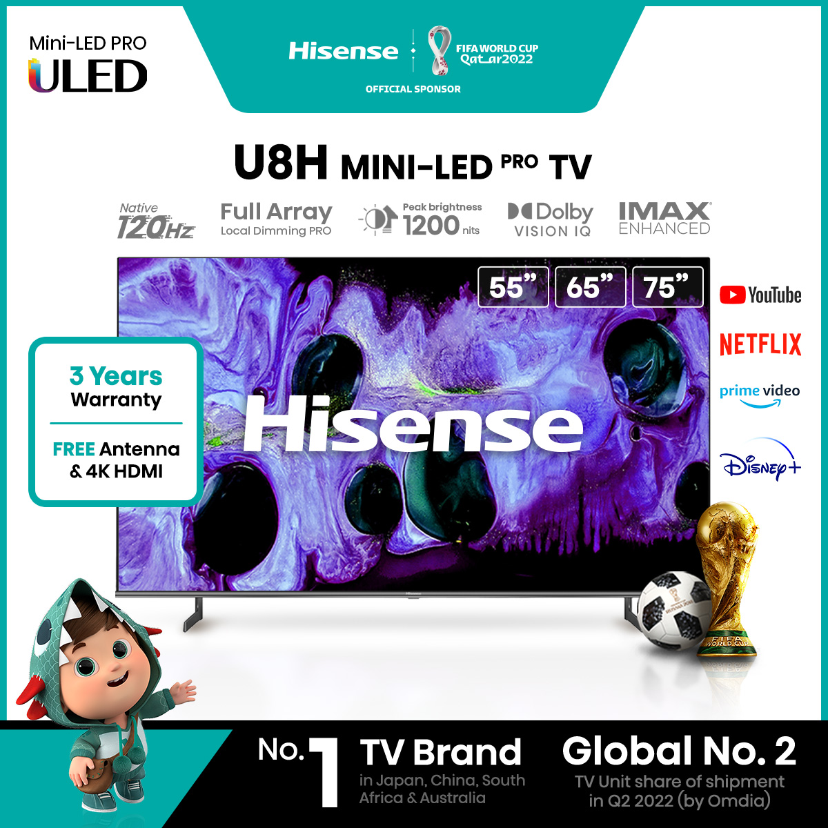 ?2022 Hisense 55" 65" 75" ULED Mini-LED 4K Smart TV (120Hz Native) ✅ FREE Delivery & Assembly ✅ FREE 3 Years Onsite Warranty ✅ FREE 4K HDMI ✅ FREE Antenna ? FREE DELIVERY 2-3 WORKING DAYS ❤️ 365 days Customer Service ? 100% Good Reviews