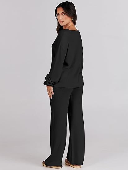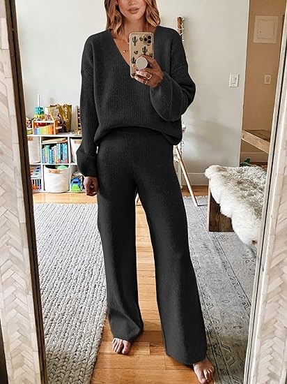 【Features】Cozy lounge sets are designed with a v neck, lantern sleeve, palazzo sweater high waisted wide leg pants, ribbed cuffs, drop shoulder, and oversized style, so you can easily create a stylish chic look, the loungewear set so versatile you can wear it any way you want