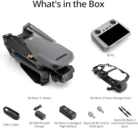 | Included Components | DJI Mavic 3 Classic Storage Cover x1, DJI RC x1, DJI Mavic 3 Low-Noise Propellers (pair) x3, DJI Mavic 3 Classic x1, DJI 65W Portable Charger x1, DJI Mavic 3 Intelligent Flight Battery x1, Spare DJI RC Control Sticks (pair) x1, USB-C Cable x1 |