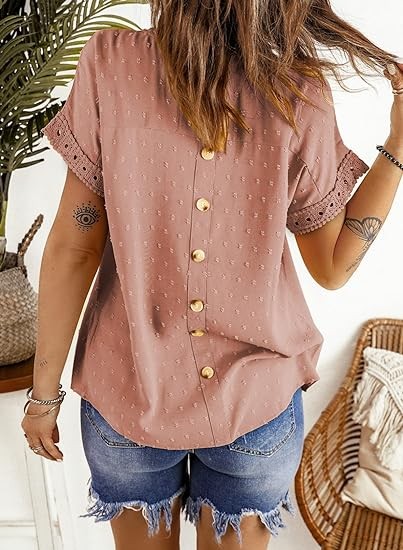 Feature: Crewneck, Solid Color, Short Sleeve, Crochet Lace Edges, Pom Pom Swiss Dots Detailing, Back Button Down Decoration, Loose Fit Tops