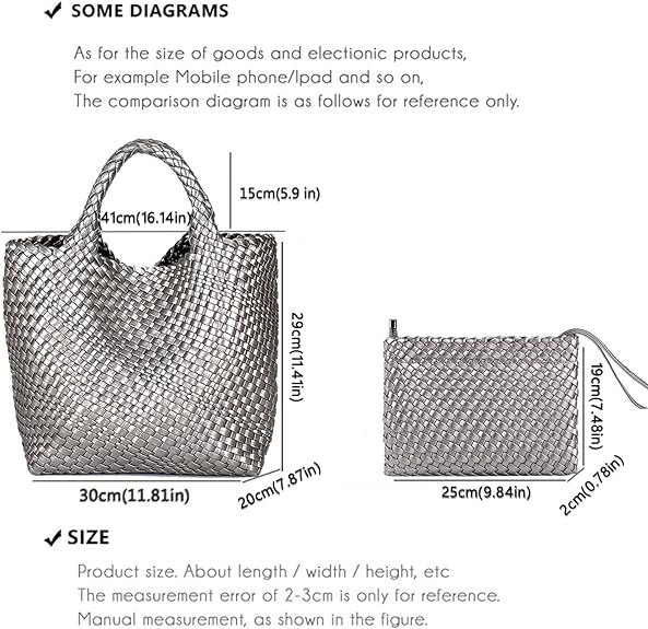 The handbag is made of soft high-quality vegan leather (slight leather smell is normal and harmless to human body, please let it dry for a few days, if you mind, take it carefully), very soft to touch and easy to wipe clean. No animals are harmed and it is good for the environment. Delicate woven detailing runs throughout the frame; inside is the same woven bag.