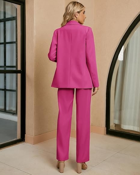 A womens 2 piece pants sets featuring a blazer with single breasted design, peak lapels, front flap pockets, and long sleeves.