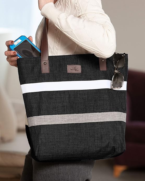 Available in three different colors — black, blue and gray — our tote bags feature a unique white and gray stripe design on their exterior giving them a stylish and versatile look. What's more, you can easily match our tote bag with any outfit that you have in your closet, so you can bring it out every day of the week, no matter the occasion.