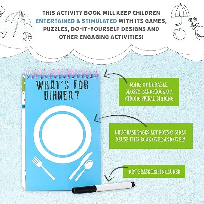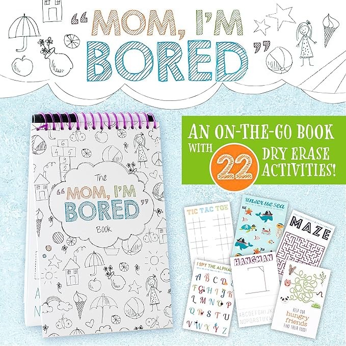 The Mom, I'm Bored Activity Book is the perfect travel game with 22 dry-erase activities. Let your child's imagination soar and keep boredom away with The Mom, I'm Bored Activity Book by Squirrel Products. This travel book has activities with a variety of skill levels. If your child can hold a pen, they are old enough to have their very own Mom, I'm Bored Activity Book.