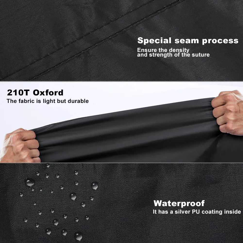 The Toptrek bicycle cover is made of high quality 210T Oxford fabric. This fabric is light but strong and durable. The inside is coated with PU silver coating, which can effectively prevent water and ultraviolet rays. Work with the special double stitch sewing technology to ensure high density and high strength of the needle thread. It is not easy to tear, also can effectively prevent water from entering.