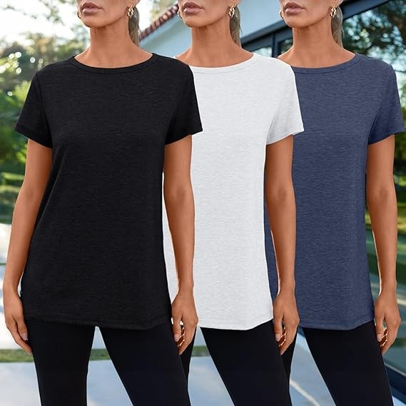 Match:This womens 3 pack short sleeve tees is easy to match with jeans, shorts, sweatpants, leggings, cago pants. Also can wear as a undershirt and match with casual coat or jacket. Creat a chic and stylish daily look.